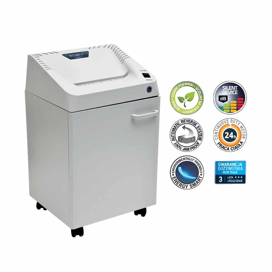 Obudowa szafkowa na kółkach zapewnia mobilność, ułatwiając przesuwanie urządzenia w biurze. Kosz o pojemności 40 litrów z optycznym wskaźnikiem napełnienia pozwala na rzadkie opróżnianie, a trwałe noże objęte dożywotnią gwarancją są odporne na zszywki i spinacze. Dioda informująca o otwartych drzwiczkach zapewnia dodatkowe bezpieczeństwo podczas użytkowania.